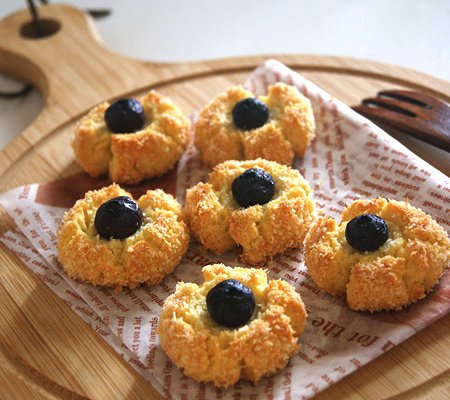 原料:低粉200克,黄油130克,鸡蛋50克(或一只),细砂糖50克,椰蓉50克(或更多,会更香)